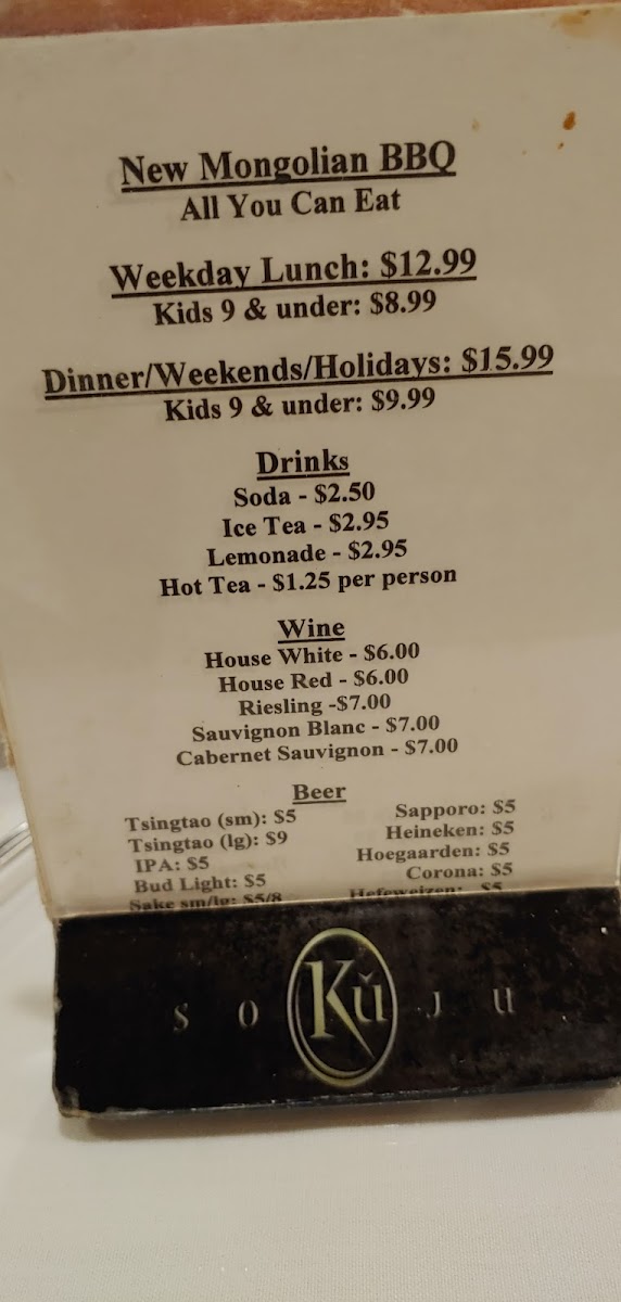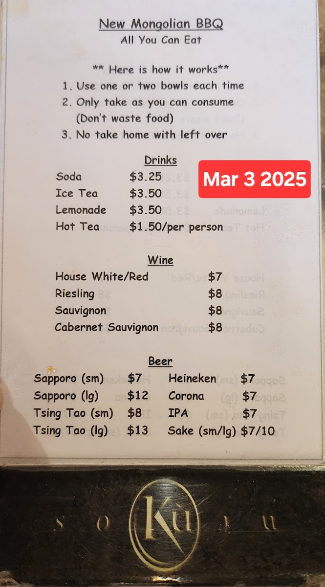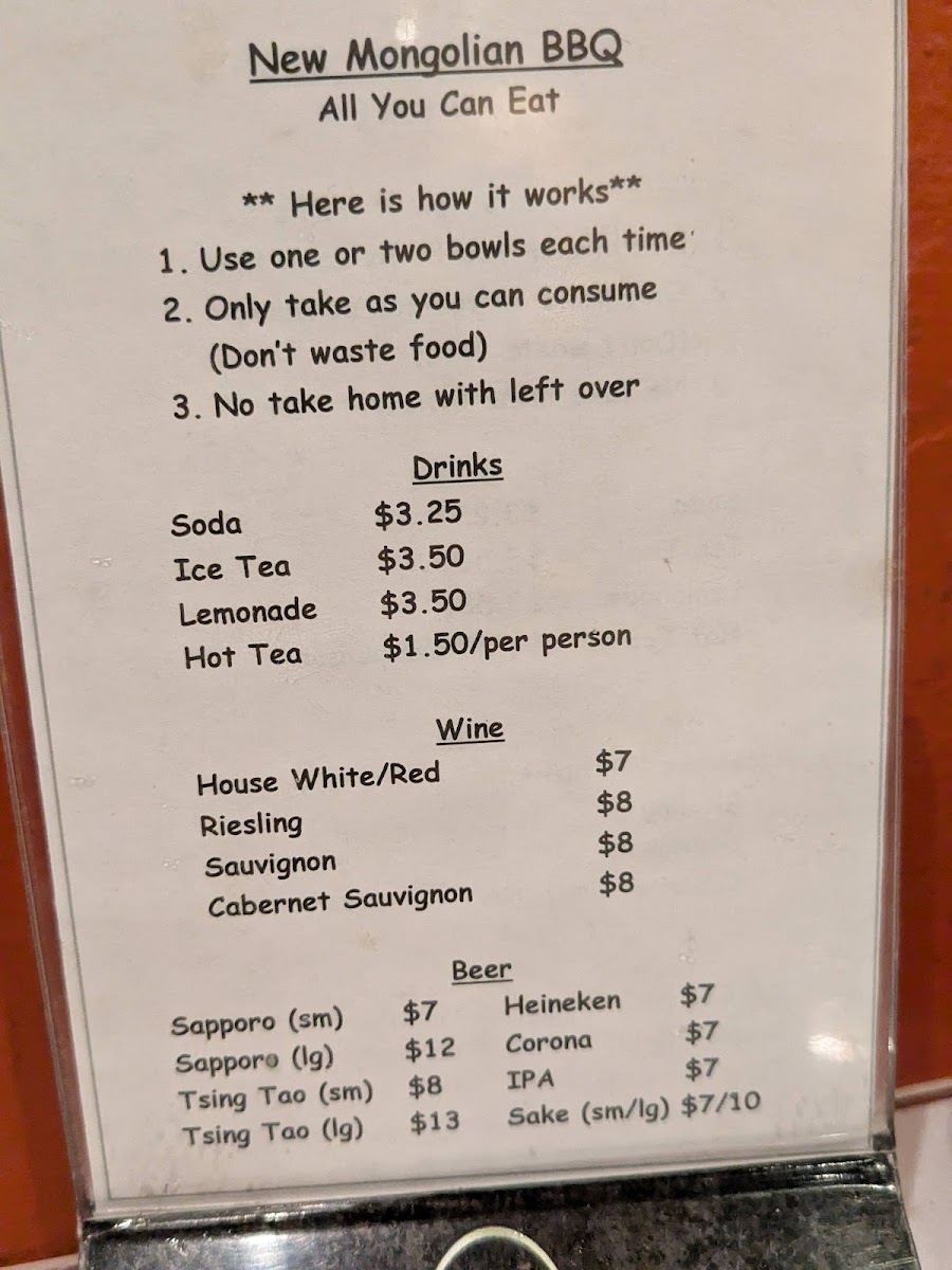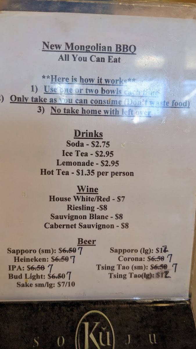 To accompany your savory dishes, New Mongolian BBQ offers a selection of refreshing beverages, including Sapporo and Heineken for just $7. If you're feeling adventurous, why not try the Tsing Tao for $8 or a classic sake at the same price? There's something for everyone to enjoy.